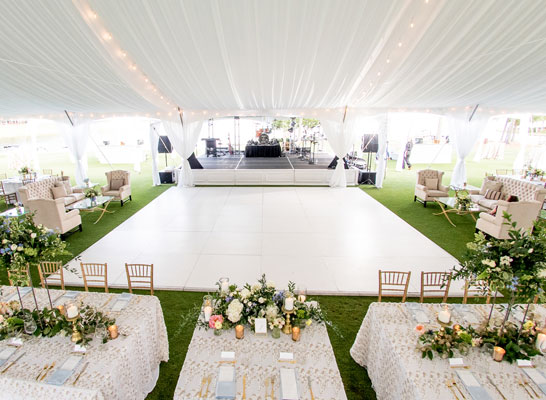 A white dance floor rental creates a timeless, elegant look that photographs beautifully. A favorite for luxury weddings and formal events, our white floors reflect light perfectly and complement any décor style, from classic to modern.